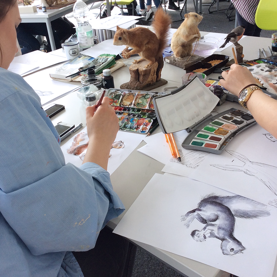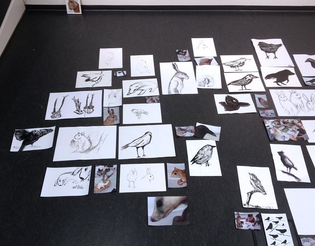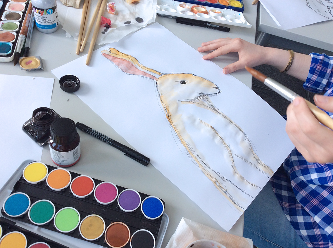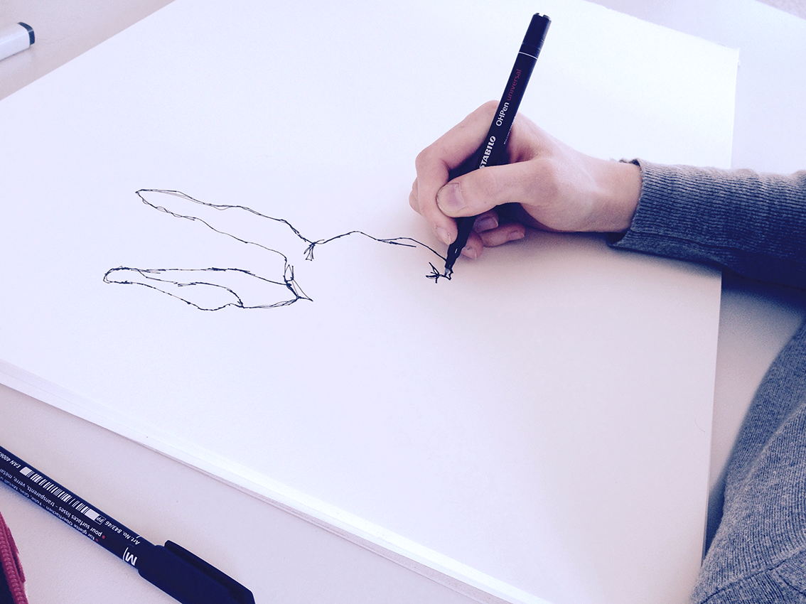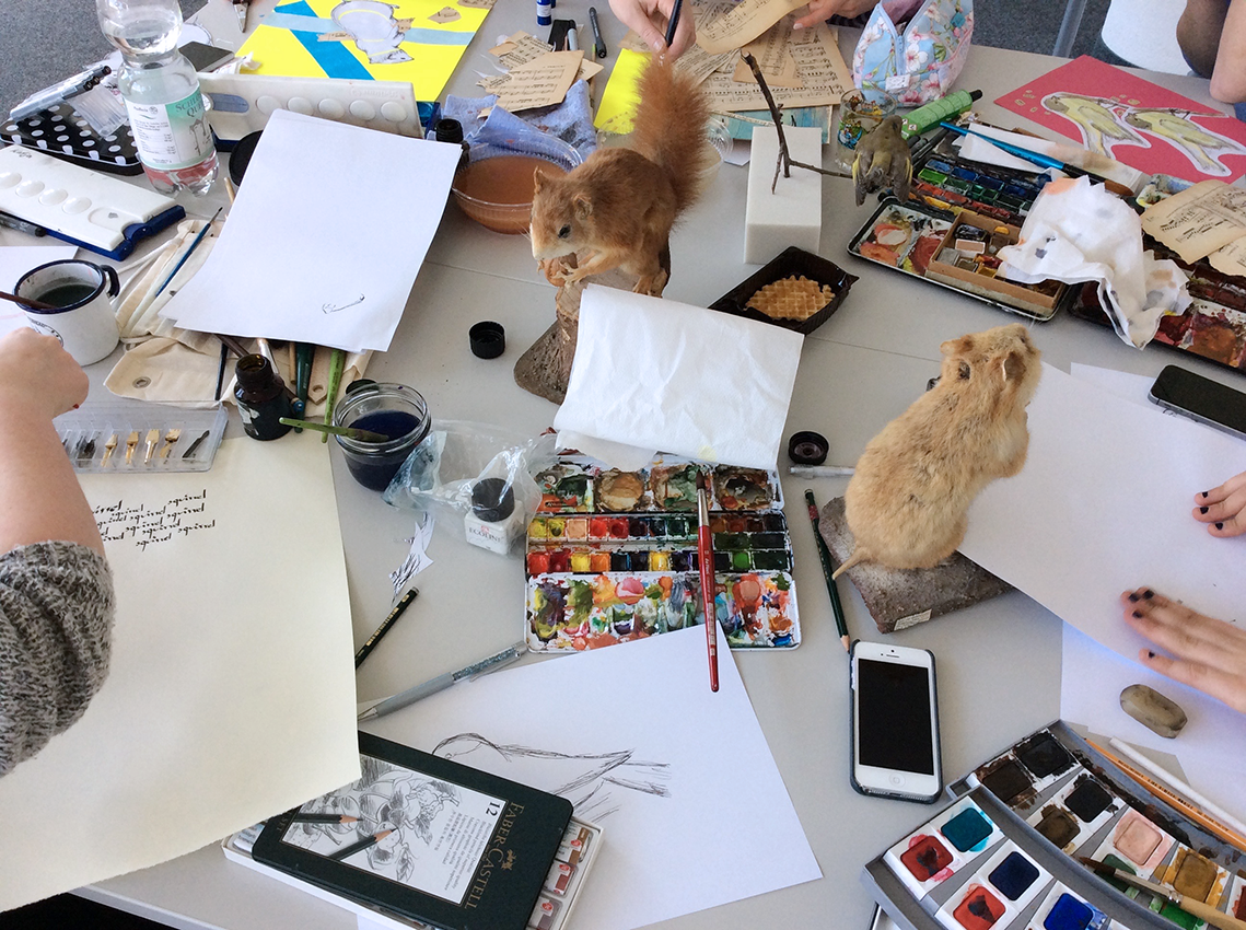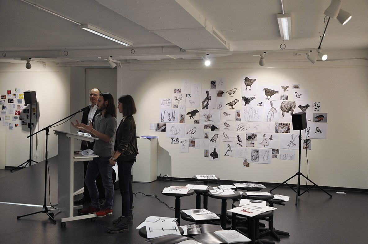 Im Illustrationsworkshop der Zweitsemester im Studiengang Kommunikationsdesign geht es um bildnerische Wahrnehmung und Darstellung von Tierpräparaten. Mit verschiedenen Übungen wird das Sehen und Begreifen des Objektes und umliegenden Raums trainiert. Darstellungsübungen wie z.B. schnelles Skizzieren, Blindzeichnen und Zeichnen mit der nicht-dominanten Hand trainieren spielerisch die bildnerische Darstellung des Objektes. Es werden verschiedenen Techniken und Materialien ausprobiert und damit experimentiert – von der konkreten Zeichnung bis hin zur freien Illustration. The illustration workshop for the 2nd semester of the communication design program focuses on the visual perception and representation of animal specimens. Various exercises are used to train seeing and conceiving the object and the surrounding space. Representation exercises such as quick sketching, blind drawing and drawing with the non-dominant hand playfully train the pictorial representation of the object. Different techniques and materials are tried out and experimented with - from concrete drawing to free illustration.